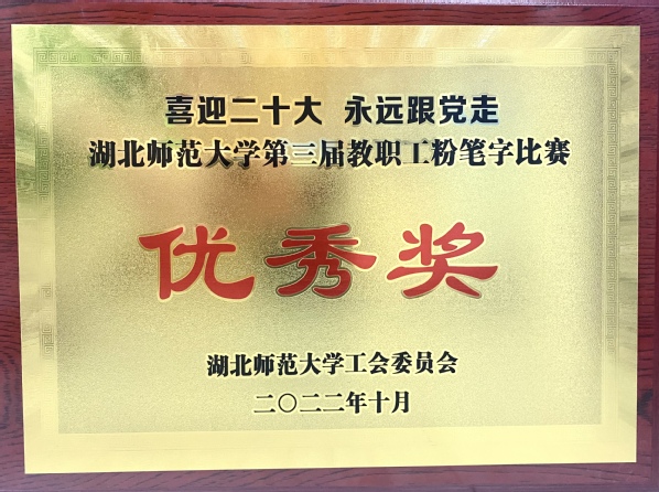 本网讯(通讯员 柯康敏)为庆祝党的二十大胜利召开,进一步推动校园文化建设,提高教师教学基本功,展示教师良好职业素养,10月20日下午,湖北师范大学举办了“喜迎二十大 永远跟党走”第三届教职工粉笔字比赛,来自各分工会共18位选手参加角逐。乐动(中国)学工部王磊老师代表乐动(中国)参加了此次比赛,荣获优秀奖。