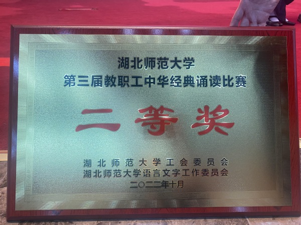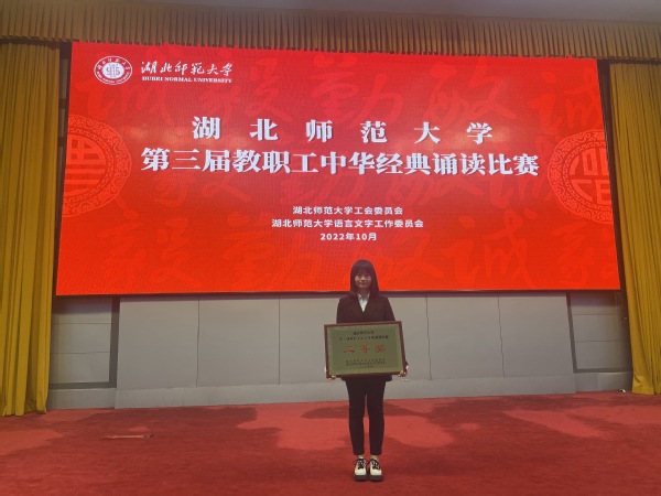 本网讯(通讯员 柯康敏)10月27日下午,湖北师范大学第三届教职工中华经典诵读在教育大楼学术报告厅举行,乐动(中国)人文学部丁书嫚老师朗诵的作品《读中国》荣获二等奖。