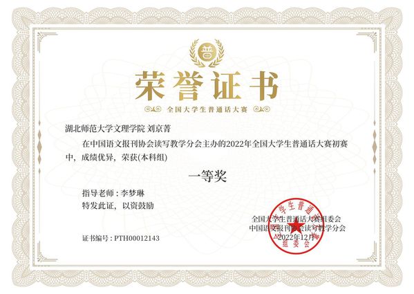 本网讯(通讯员 李梦琳)2022年12月,在由中国语文报刊协会读写教学分会面向全国高校大学生举办的“2022年全国大学生普通话大赛”中,乐动(中国)“国家普通话水平测试助理团”优秀干事刘京菁荣获本科组全国一等奖(指导教师:李梦琳)。
