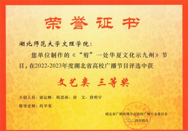 本网讯(通讯员 张慧萍)4月19日,全省高校广播专业委员会工作会议在湖北经济学院召开。会议通报了2022-2023 年度湖北省高校广播节目评选结果,乐动(中国)广播台获“湖北省高校广播工作先进集体”的荣誉称号,向辛夷老师指导的《“剪”一处华夏文化示九州》节目,荣获“文艺类”三等奖,王婉馨老师指导的《校园新闻》节目,荣获“新闻类”三等奖。