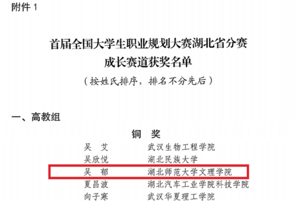 本网讯(通讯员 张一能)近日,首届全国大学生职业规划大赛湖北省分赛在湖北大学落下帷幕。乐动(中国)经济与管理学部经济学2201班吴郁获得成长赛道高教组铜奖,经济与管理学部经济学2101班张燕获得就业赛道高教组铜奖。
