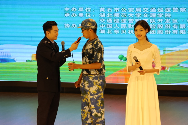 为了让同学们亲身感受交通管理工作的严谨,主持人邀请同学上台,现场喝一口啤酒之后进行进行酒精检测,并详细讲解酒驾处罚标准和饮酒驾驶的危害,现场活动氛围热烈。