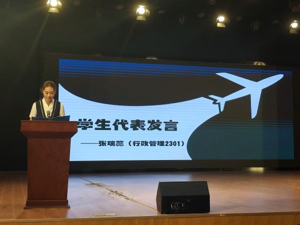2023级优秀学生代表张瑞蕊分享了在校期间学习的心路历程。她坦言,初入校时经历过焦虑和迷茫。但翔宇航空产业学院,有着浓厚的求学氛围,她学会了“凡事预则立,不预则废”。作为学生,不能给自己设限,向上向善,方能收获真知,成为翔宇学院的骄傲。