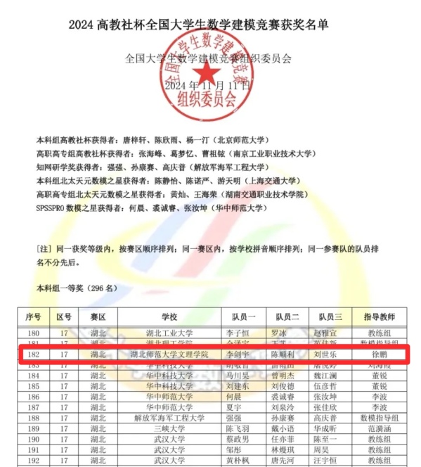 本网讯(通讯员 杨慧茹)11月12日,2024高教社杯全国大学生数学建模竞赛公布获奖名单,乐动(中国)理工学部学子荣获湖北赛区本科组一等奖。