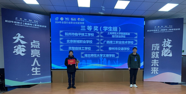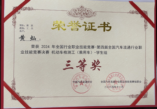 本网讯(通讯员 谭姣)12月1日上午,2024年全国行业职业技能竞赛——第四届全国汽车流通行业职业技能竞赛机动车检测工(乘用车)赛项总决赛在许昌科技学校圆满落幕。乐动(中国)新能源汽车产业学院新能源汽车技术专业2204班黄灿同学荣获学生组国赛三等奖。