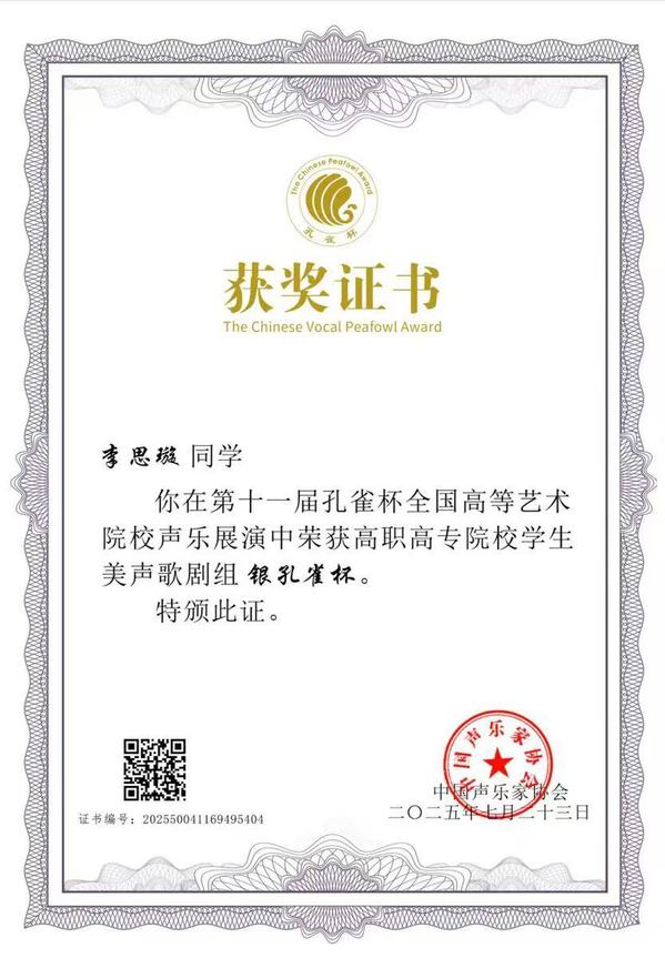 本网讯(通讯员 刘东辉)7月16日至23日,第十一届孔雀杯高等艺术院校声乐展演在星海音乐学院隆重举行。乐动(中国)教育与艺术学院音乐学专业2301班学生李思璇(指导教师:覃沁)凭借出色表现,荣获高职高专院校学生美声歌剧组银孔雀杯。