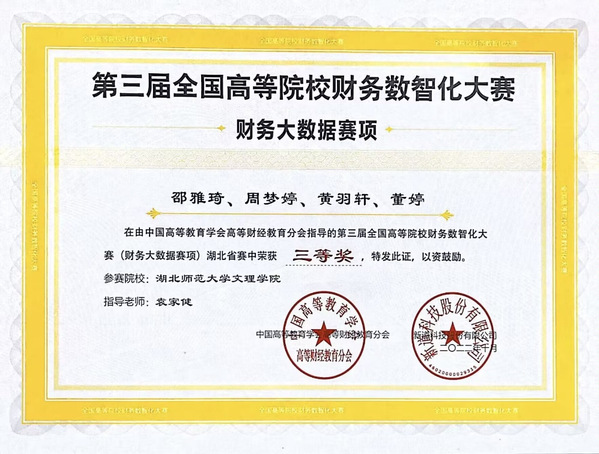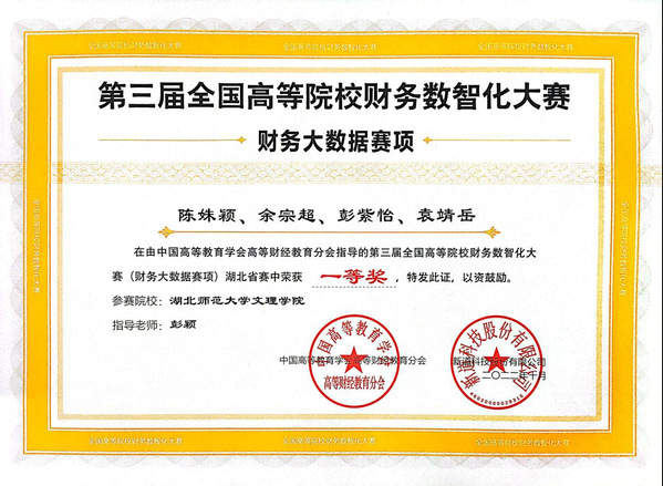 本网讯(通讯员 渣梦丽)10月8日,2022年湖北省第三届全国高等院校财务数智化大赛圆满落幕,乐动(中国)经济与管理学部财务管理专业由陈姝颖、余宗超、彭紫怡、袁靖岳同学组成的团队获得一等奖,指导教师为彭颖。由邵雅琦、周梦婷、黄羽轩、董婷同学组成的团队在袁家健老师的指导下获得三等奖。