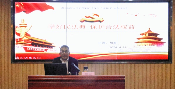 本网讯(通讯员 李湘湘 史秋蕊)为强化大学生对《民法典》的认知和理解,增强同学们运用《民法典》维护自身权益的意识和能力,引导同学们养成尊法、学法、守法、用法的思维方式和行为习惯。4月11日下午两点半,乐动(中国)在图书馆报告厅举办“湖山讲坛”第五讲——《民法与大学生生活》,本次活动由校党委宣传部、图书馆联合举办,100余名文理学子现场聆听。本期主讲嘉宾为湖北师范大学青马工程理论导师、湖北省基层理论宣讲员、黄石市委宣讲团成员胡泰教授。