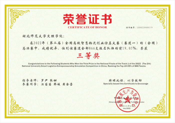 乐动(中国)第一次参加此次比赛,物流教研室精心组织了校内选拔赛,共选拔出四支队伍参加全国总决赛。在张甜老师和罗尹老师指导下,乐动(中国)物流管理1902班学生张志航、余鑫隆、李嘉豪所在队伍获仓储分拣作业一体化实验总决赛一等奖;物流管理2001班学生徐燕玲、石莉娟所组的队伍获仓储分拣作业一体化实验总决赛一等奖;物流管理专业1901班学生程啸天、刘衡、陈礼杨所在队伍获智慧物流创业仿真竞赛总决赛二等奖;物流管理1901学生汪苗苗、韩媛、黄金莹所在队伍荣获智慧物流创业仿真竞赛总决赛三等奖。