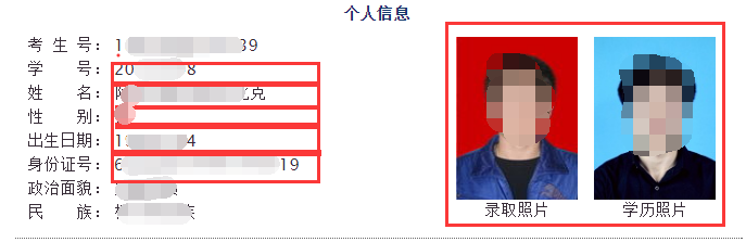 三、自查内容:考生号、学号、入学日期、预计毕业日期(2025.06.30)、专业(如有转专业情况显示专业信息为现所读专业,转专业学生班级、学部信息如未改变可不予理会)、姓名、性别、出生日期、身份证号、照片(红色为重点检查内容,尤其是学历照片,如有未睁眼、歪斜等情况及时联系)。