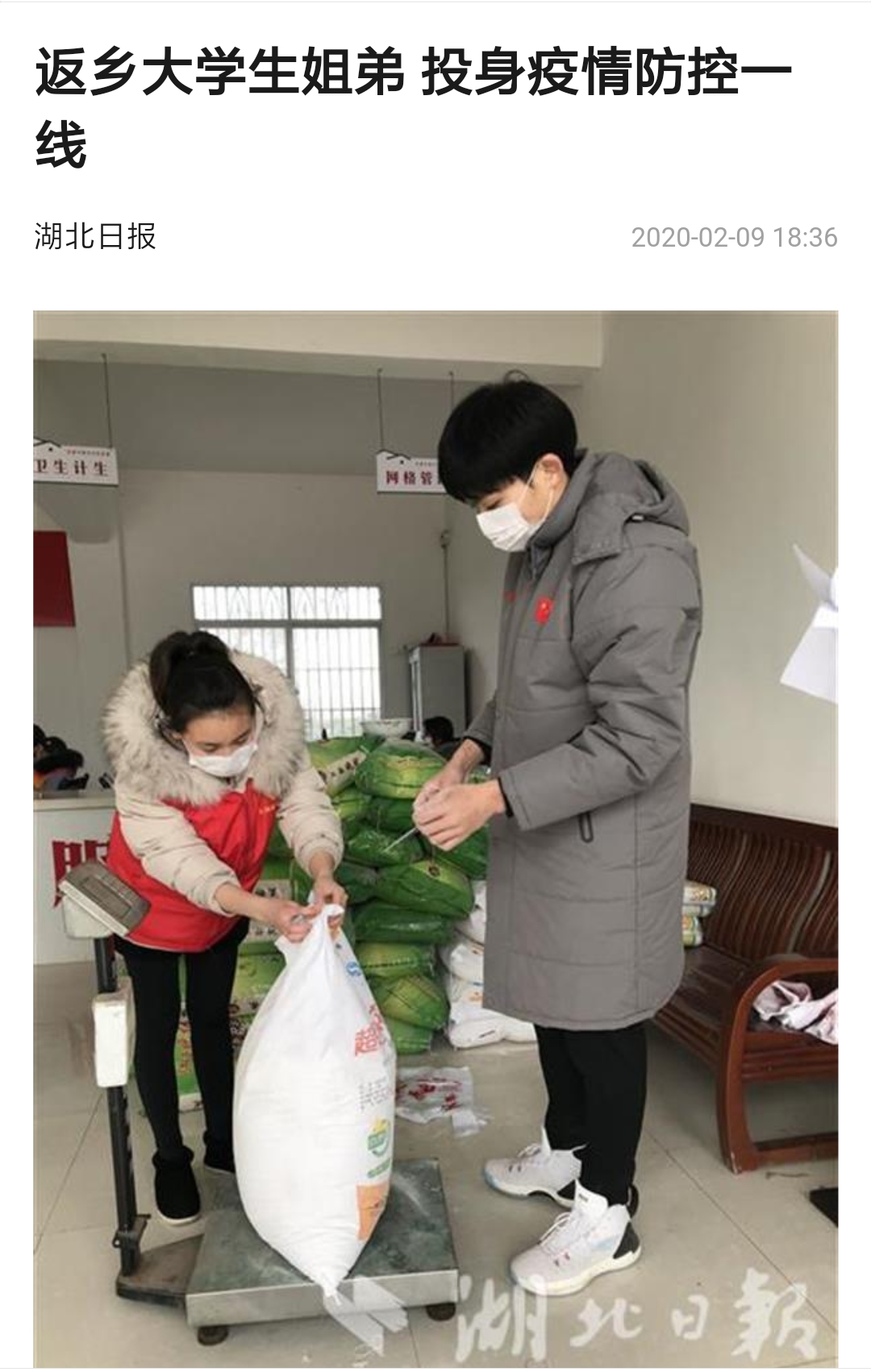 2020年2月9日,湖北日报上有一篇关于疫情防控的新闻引起广泛关注,主人翁正是乐动网页版理工学部数学与应用数学专业1603班的吕奎同学和其弟弟吕东阳。据报道,2020年2月7日,姐弟俩从村微信群里看到“志愿者征集令”后,2月8日一大早便到三州村委会报到,参与对村民生活必需品的分装与发放。图片中是2月8日当天,他们在枝江市百里洲镇三洲村防疫物资分配现场填写订购物资的订购居民的姓名并给居民分配物资时的情景。姐弟俩一个牵着口袋,一个则对袋中面粉进行分装。分装完面粉后,又开始为居家隔离的村民分装集中采购的大米、面条和新鲜的蔬菜并贴上标签,以备村组干部精准送达村民家中。