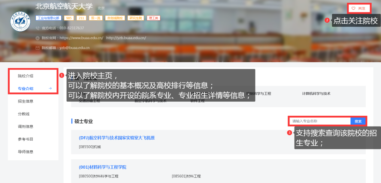 产品提供用户科学规范的查询工具,查询了解其感兴趣的研招院校或专业,支持通过院校查询研招专业、通过专业查询其开设院校,通过多维度关系的数据分析,帮助用户了解掌握研招院校的基本情况、硕士专业的基本信息、专业当年招生详情、考试范围等。