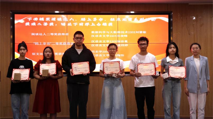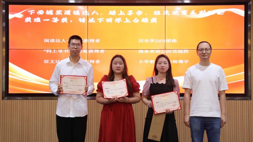 杨学斌宣读了此次“读书月”系列活动获奖名单。现场对获得阅读达人、“码上寻书”比赛、主题征文比赛、《钢的城》讲书人大赛获奖的个人,获得书香班级和书香学部的集体进行了颁奖。