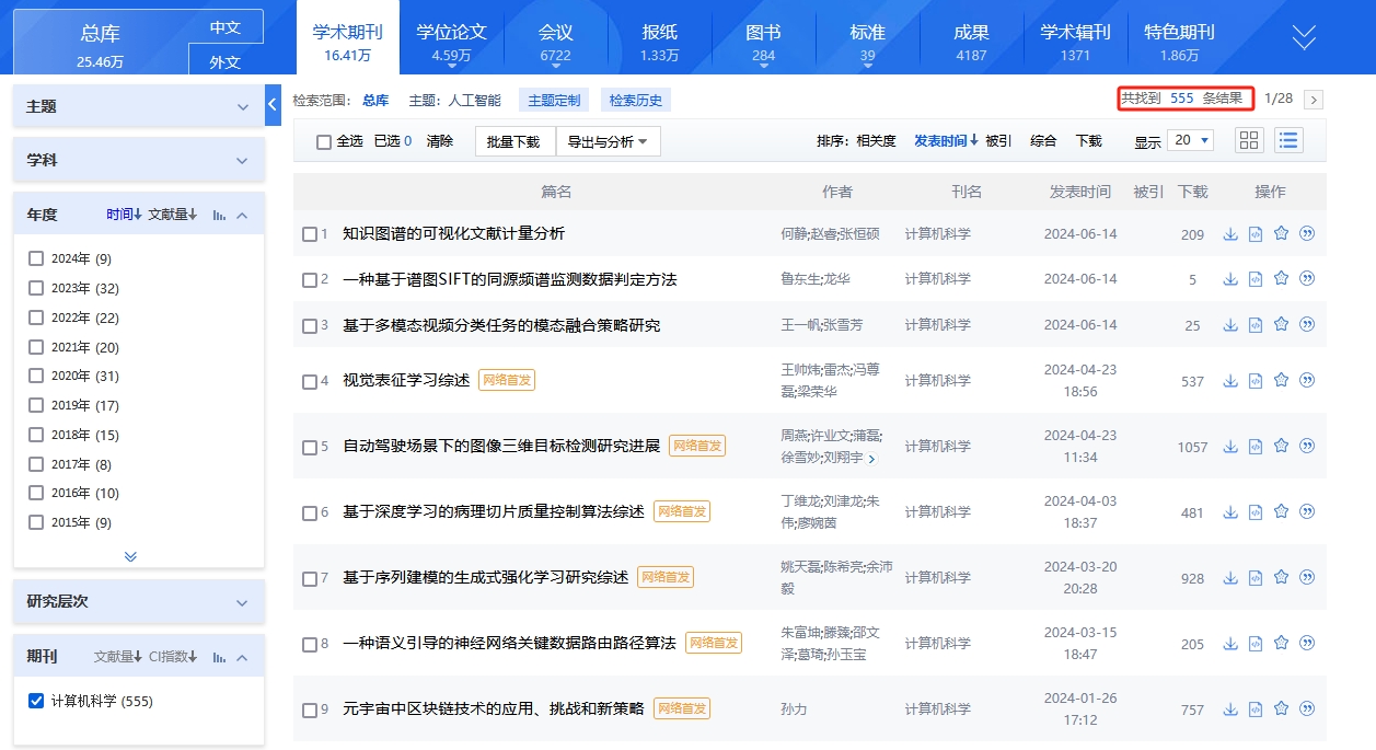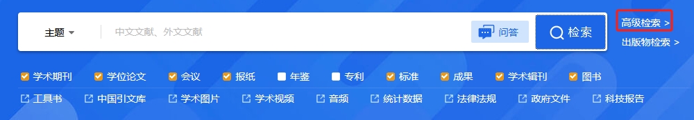 平台检索涵盖的资源类型有:学术期刊、学位论文、会议、报纸、年鉴、专利、标准、成果、图书、学术辑刊、特色期刊。