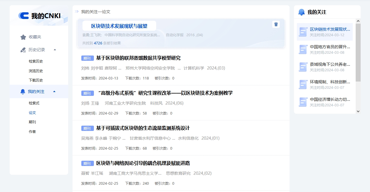 登录个人账号后,可在文献知网节页面点击按钮关注论文。进入我的CNKI-我的关注-论文,可查看已关注论文的引证文献,管理已关注论文。