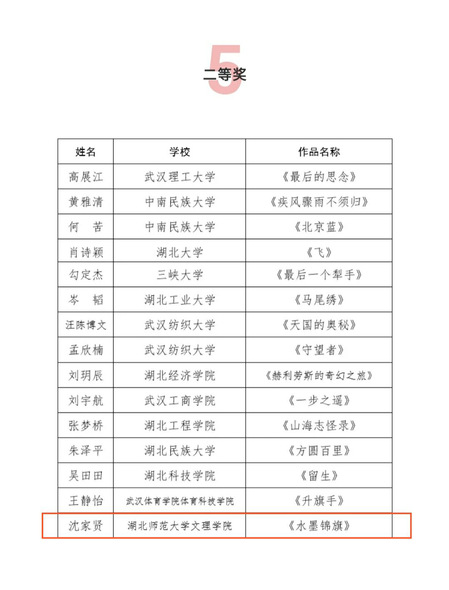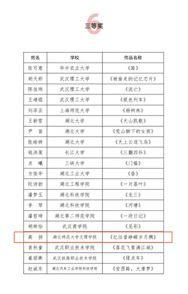 2019年9月湖北省作家协会、湖北省学生联合会联合下发了《关于举办湖北省高校第十八届“福创杯”新青年小说大赛的通知》。大赛自启动以来,我校高度重视、广泛动员,文理学子踊跃报名。其中沈家贤、高扬两人作品打入决赛,榜上有名,展现了乐动(中国)学生过硬的综合素质,凸显了乐动(中国)文化育人的工作实效。