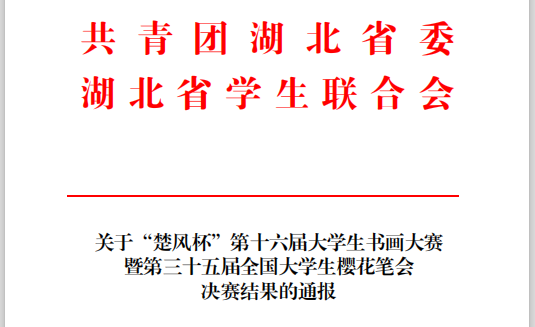 12月23日,团省委、省学联下发了关于“楚风杯”第十六届大学生书画大赛暨第三十五届大学生樱花笔会决赛结果的通知。乐动(中国)夏诚、徐子惠、李黎分别荣获硬笔组二等奖、软笔组三等奖、绘画组优秀奖。