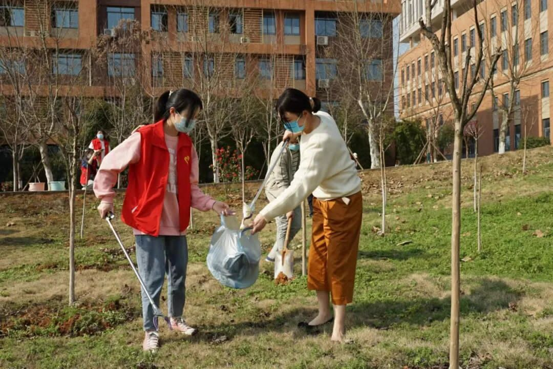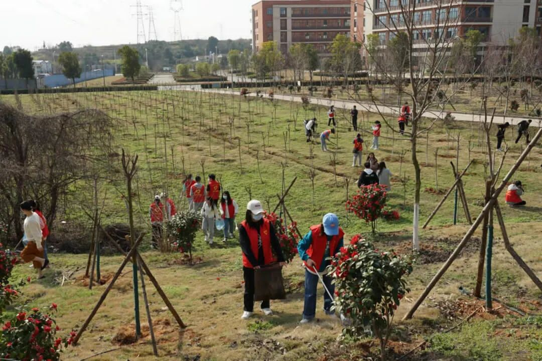 此次活动以“喜迎二十大,共护青春林”为主题,积极向上,凝聚先进。活动现场,志愿者们辛勤劳动,给树木松土、除草,浇水,拾捡周边垃圾,道道工序,一丝不苟,配合默契。汗水淌过脸颊,鞋裤沾满泥土,师生们依旧乐此不疲,欢声笑语不绝于耳,一排排红色的马甲沐浴春光,绽放出希望之花。