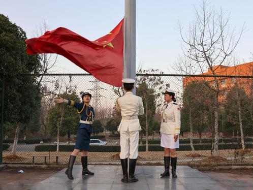 仪式第一项,国旗护卫队出旗,升国旗奏唱国歌,全体师生行注目礼,国旗冉冉升起。