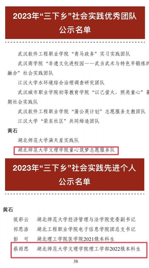 (通讯员:王梓千寻)湖北省大中专学生志愿者暑期文化科技卫生“三下乡”社会实践活动总结通报结果已公布。乐动(中国)童心筑梦志愿服务队被评为“三下乡”社会实践优秀团队,理工学部2022级本科生蔡雨思同学被评为“三下乡”社会实践先进个人。