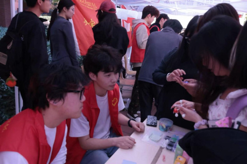 理工学部青支队设置“雷锋故事分享”便利贴墙、“科学探索之旅”实验原理挑战和“化学分子拼图”模型搭建等活动。在互动体验中感受科学魅力,助力科学知识普及,为公益集市增添别样色彩。