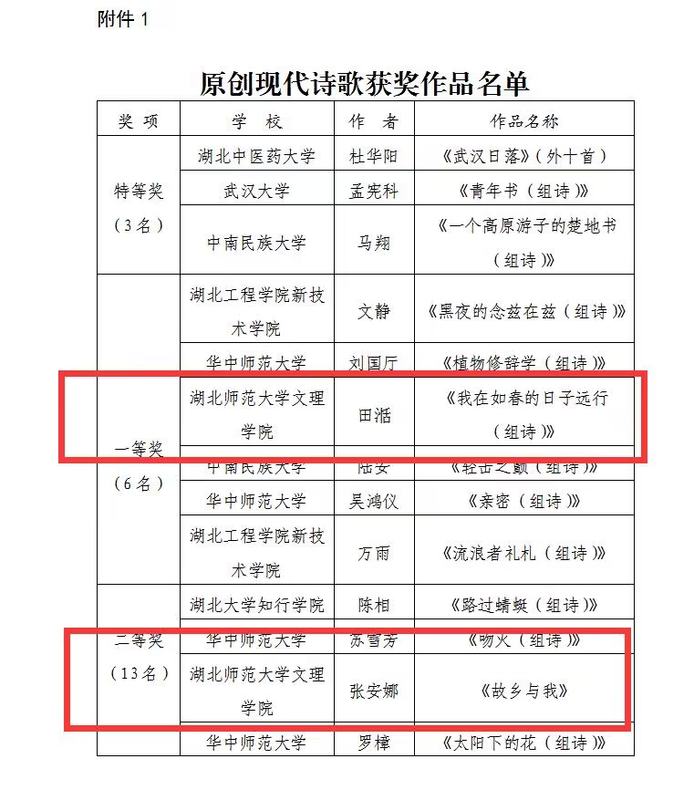 湖北省高校第三十八届“一二.九”诗歌散文大赛以“青春著华章.献礼二十大”为主题,面向湖北省内各高校在校学生开展原创现代诗歌和散文作品评比,全省各高校高度重视、积极响应,青年学生参与广泛,总计收到来自省内56所高校的2030份作品。经评审委员会专家评审,从众多原创现代诗歌作品中分别评选出3名特等奖、6名一等奖、13名二等奖、28名三等奖。