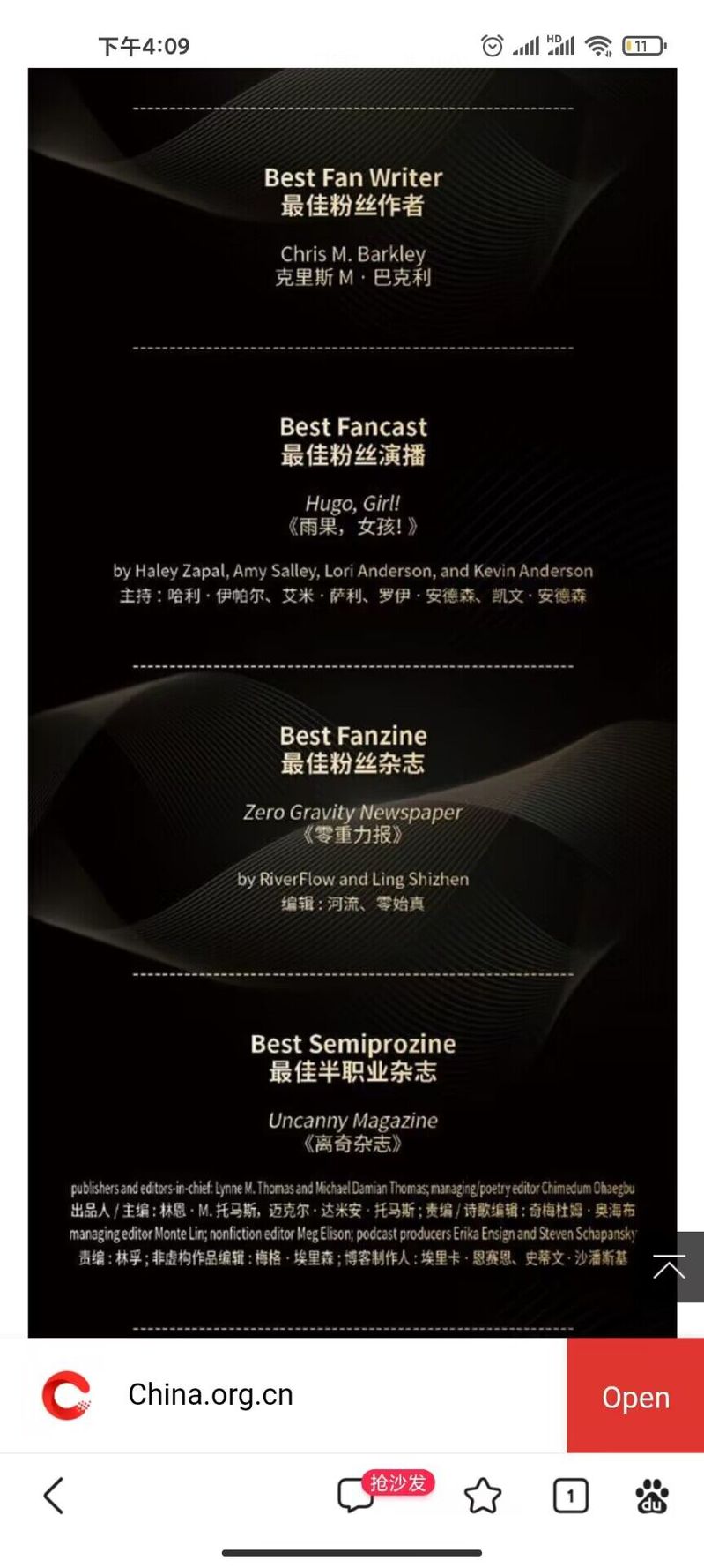 人文学部中文专业2205班学生温卓峰主编的科幻杂志《零重力报》在世界科幻大会获得“最佳粉丝杂志”的荣誉称号