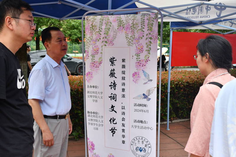 为了传承和弘扬汉字文化,让更多同学了解并爱上诗词,加强校园文化建设,加深同学们对中华优秀传统文化的认识和理解,提高自身文化自信,2024年6月4日上午,人文学部发挥学部优势与力量,在活动中心精心筹办以“紫薇绽放诗意浓,以诗会友赏华章”为主题的紫薇诗词文化节,学部主任熊子延、党总支书记周景斌带领学部辅导员老师亲临活动现场。本次活动依托文理校园“紫薇花”特色,活动圆满落幕,为广大师生带来了一场别开生面的文化盛宴。
