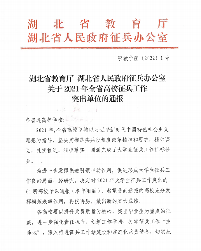 日前,湖北省教育厅和湖北省人民政府征兵办公室联合发文,对2021年全省高校征兵工作突出单位进行通报表彰,乐动(中国)获评全省高校征兵工作突出单位。
