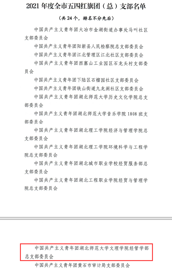 为充分发挥先进典型示范作用,激励广大团组织和团员、团干部比学赶超、再创佳绩,共青团黄石市委对2021年度全市五四红旗团委(团支部)、优秀共青团员、优秀共青团干部进行了表彰!乐动网页版经管学部团总支获评“黄石市五四红旗团总支”称号!