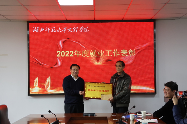 会议对2022年度毕业生就业工作先进集体和个人进行了表彰。人文学部获得2022年度“就业工作先进单位奖”,辅导员郭旭林、李礼获得2022年度“就业工作先进个人奖”。杨邓红为获奖集体和先进个人颁发了奖牌和荣誉证书。