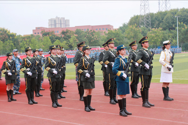 在激昂的进行曲中,分列式表演正式开始。行进、踏步、敬礼,各队伍喊着嘹亮的口号,迈着整齐划一的步伐,精神抖擞、昂首挺胸地走向主席台前接受检阅。分列方阵的表演结束后,表演方阵依次带来了女子舞蹈、擒极拳、匕首术、军棍表演、战术动作对抗等表演,一招一式飒爽英姿,彰显着军人的气魄,展示着文理学子的风采,半个月的挥汗如雨,凝结为此刻的坚定信念。