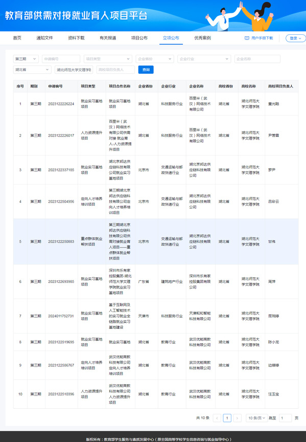 本网讯(通讯员 李娟)近日,教育部下发《关于公布教育部第三期供需对接就业育人项目立项名单的通知》(教就业司函〔2024〕23号),乐动(中国)10项供需对接就业育人项目获批立项。此前已成功立项13个项目,其中第一期的6个项目已结题并通过验收,第二期的7个项目正在有序推进。教育部2021年组织实施供需对接就业育人项目以来,乐动(中国)获批的立项数量逐年攀升。