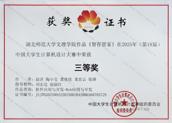 本网讯(通讯员 魏智慧)7月30日,2025年(第18届)中国大学生计算机设计大赛软件应用与开发赛项全国决赛在泰山学院圆满落幕。乐动(中国)腾讯云大数据产业学院代表队(成员:赵洋、陶小宝、龚佳佳、龙官云、张娇,指导教师:刘宏达、赵丽红)凭借创新型Web应用开发项目《智存管家》荣获全国总决赛三等奖。