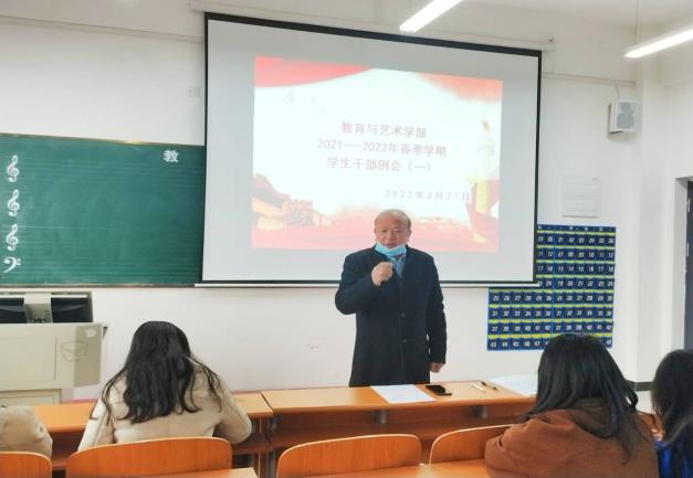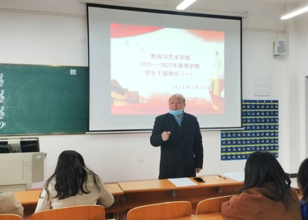 2022227日下午500,教育与艺术学部按照惯例在实验楼一栋403多媒体教室组织召开学生干部工作例会。出席本次会议的人员有学部辅导员老师、各专业班级负责人及团学会全体干部参加。例会由总支书记李先华主持。