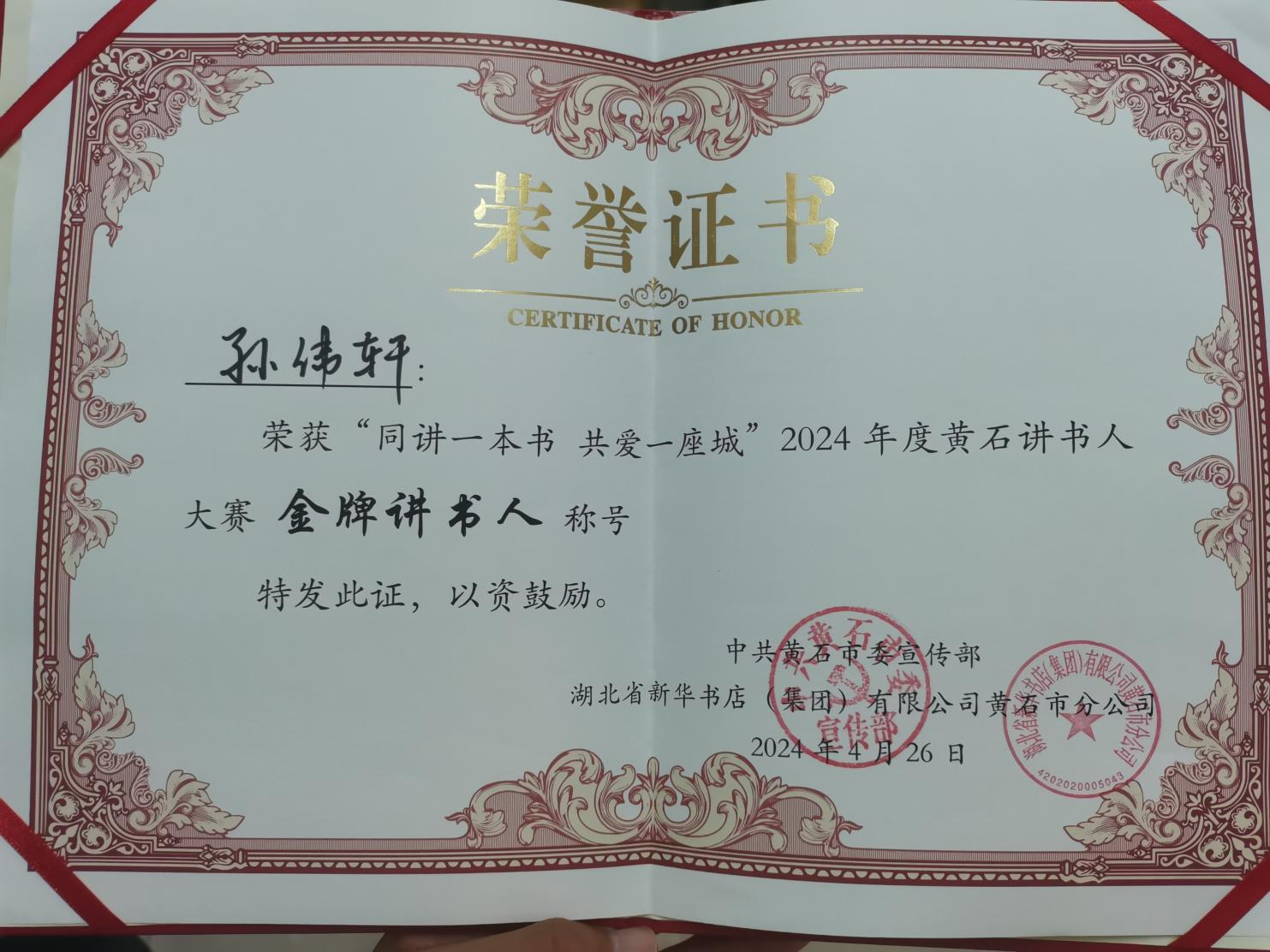 2024年4月26日15:00,由中共黄石市委宣传部、湖北省新华书店黄石市分公司共同举办的“同讲一本书共爱一座城”2024年度黄石讲书人大赛决赛在黄石日报社智慧融媒演播大厅举行。