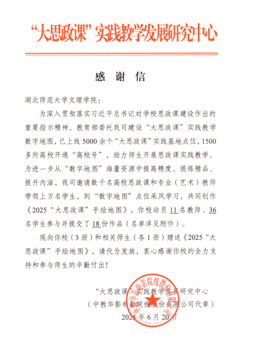 近日,“大思政课”实践教学发展研究中心与中教华影电影院线股份有限公司联合向乐动网页版发来感谢信,对学校积极参与《2025“大思政课”手绘地图》创作工作、助力“大思政课” 实践教学发展给予高度认可与诚挚感谢。